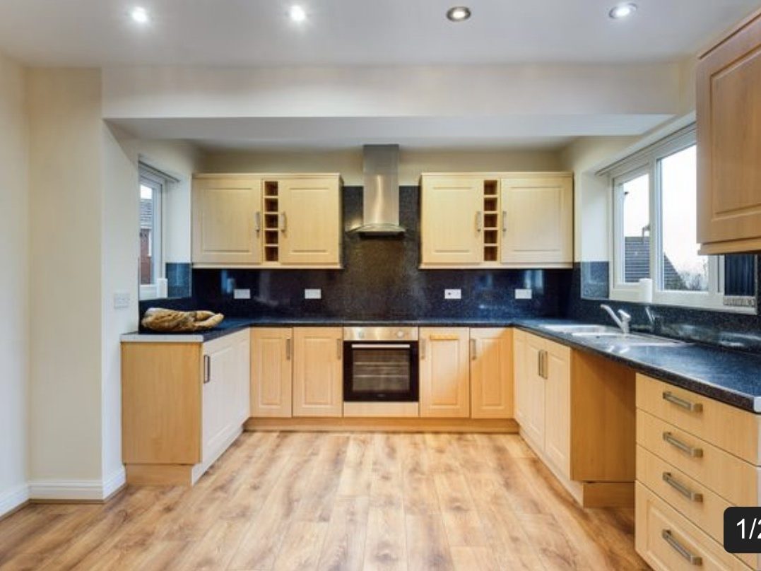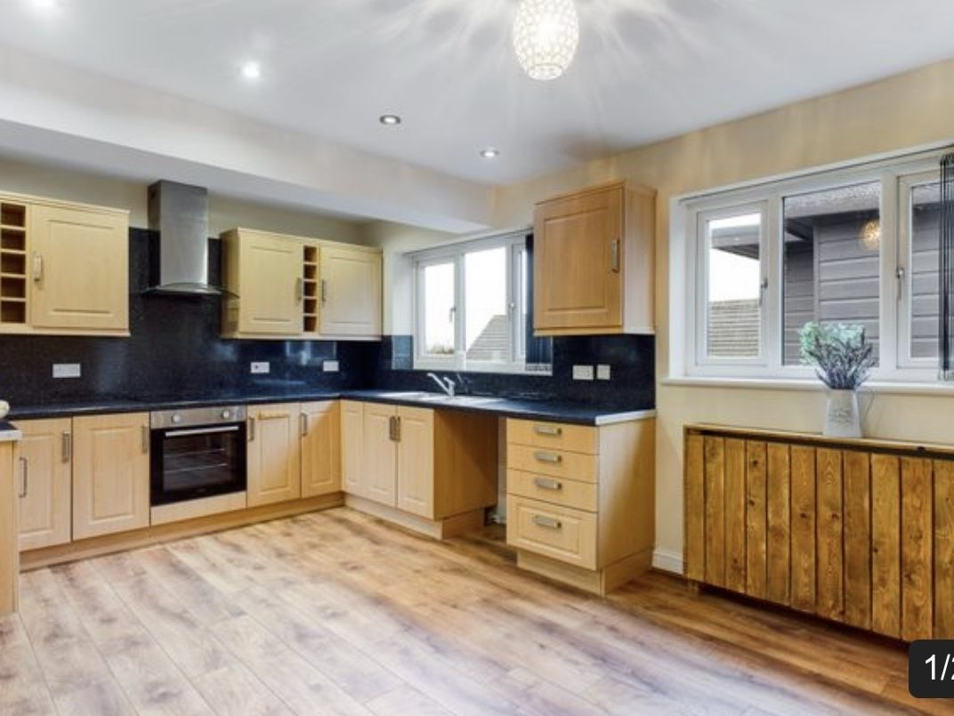 The house itself has two entrances. The main front entrance, dark and compact with a closet housing the boiler and fuse board, led us to prefer using the ‘back door’ – the one with the letterbox. This door opens into an open-plan living-dining-kitchen area. Here, the living space hosts a small, tiled fireplace with an electric fire, while the kitchen-dining area presents challenges with its orange wood cupboards, black countertops marred by wear, and a rusting silver sink with incorrectly fitted taps.