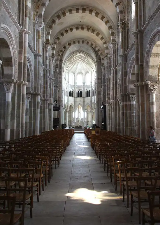 Figs. 3,4: Romanesque vs. Gothic Arches. Fig. 3: The Collector (2022) [photograph] The nave of Marie Madeleine in Vezelay, France. Fig. 4: Wikipedia (2024) [photograph] Pointed arches form the rib vaults of Worcester Cathedral (1084 – 1504).