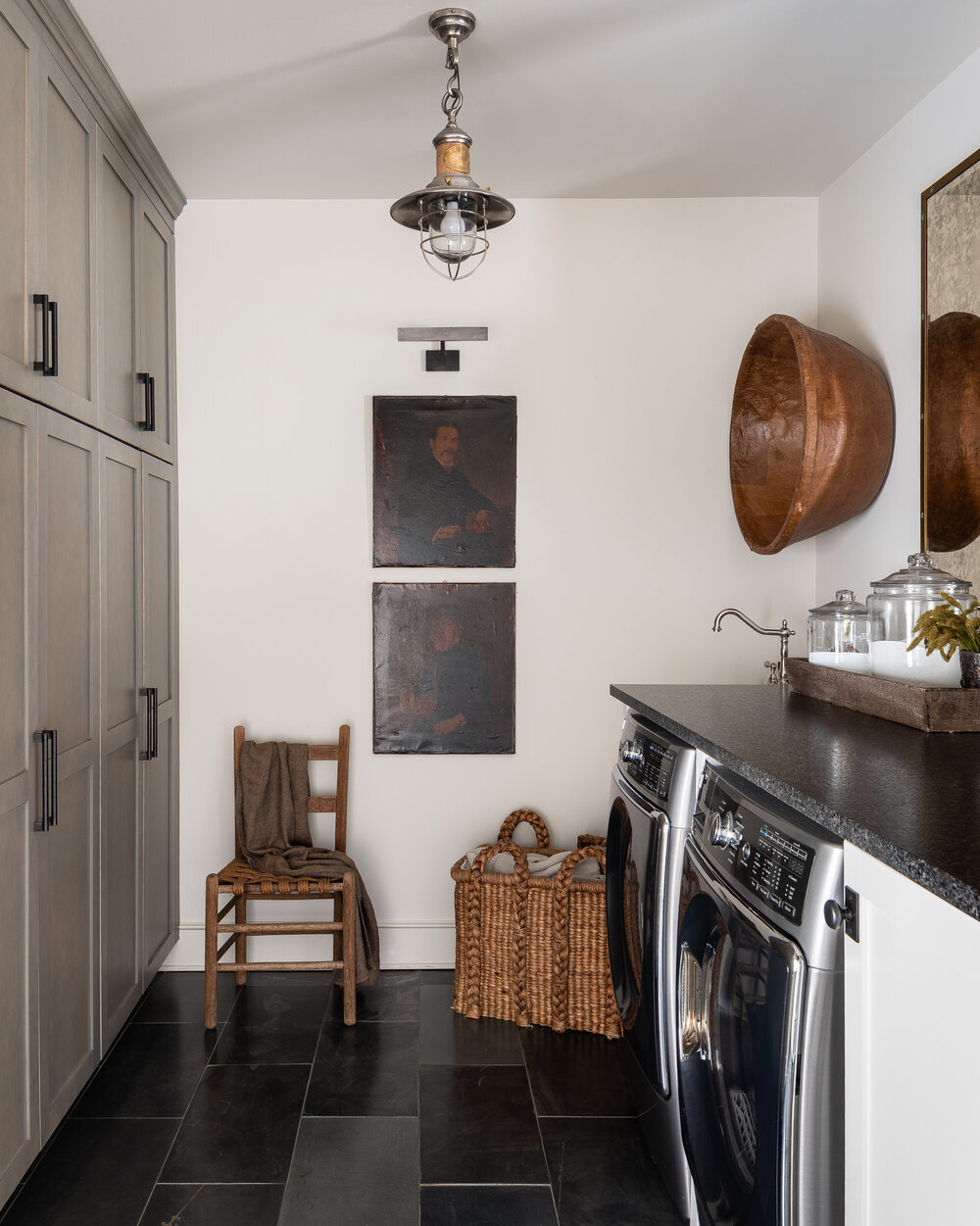 The utility room designed by Sean Anderson in the Old Creek project beautifully exemplifies the thoughtful blending of functionality with aesthetic sophistication. This space, depicted in the attached image, is an eloquent narrative of Anderson’s design philosophy which harmonizes the modern with the timeless. The room features slate gray cabinetry that offers ample storage while maintaining a sleek, unobtrusive profile. These are contrasted sharply against the dark slate floor tiles, which not only enhance the room’s practicality but also anchor the space with their robust, enduring charm.