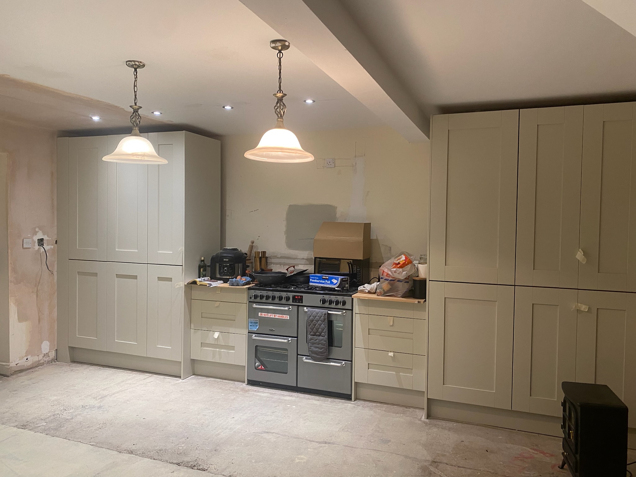 Once the old kitchen was cleared, the space was a blank slate ready for transformation. The next priority was first-fit electrics and plastering, which created a solid foundation for the next stages. We were on a tight timeline, aiming to make the space usable for the holidays.