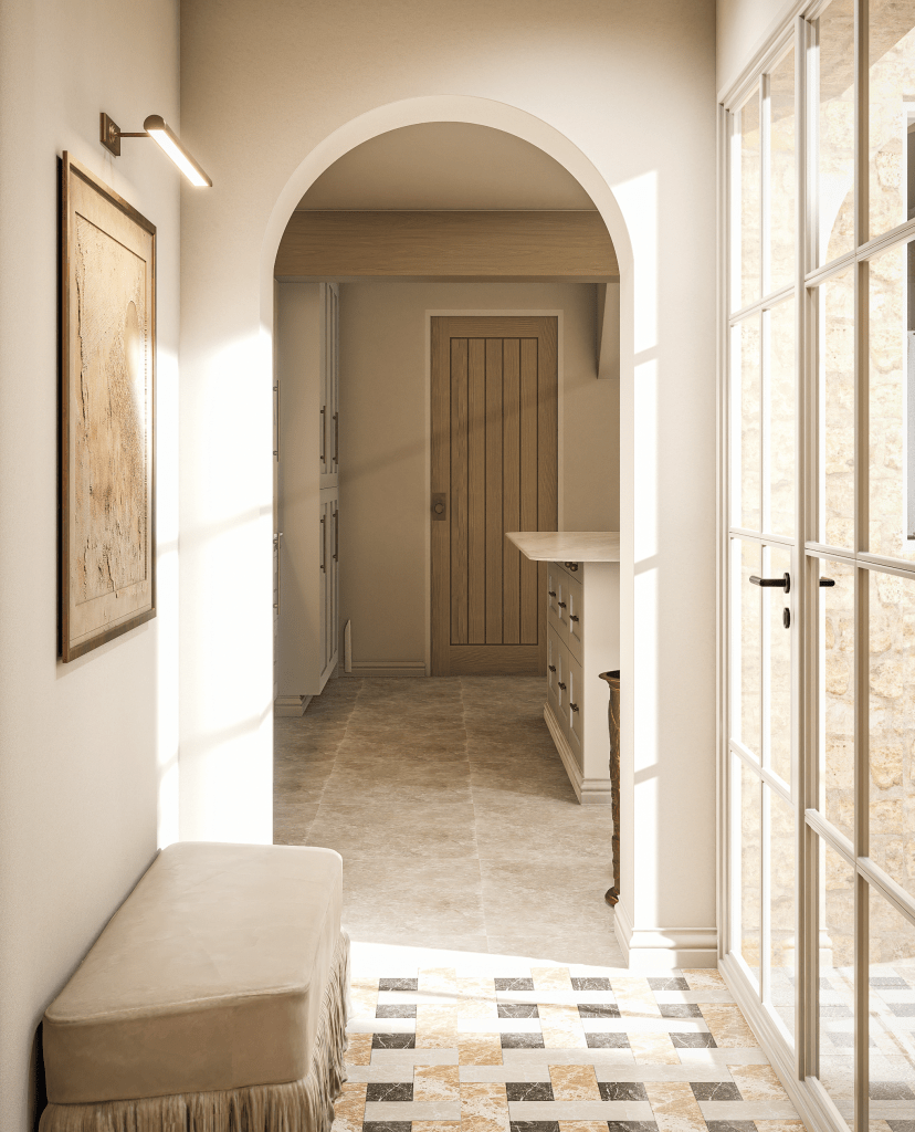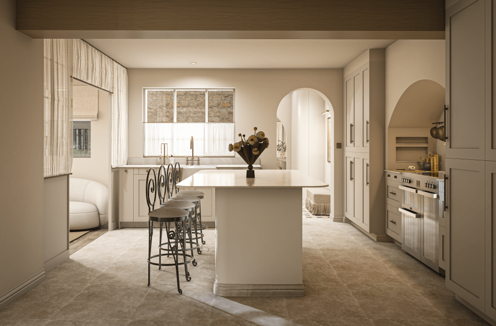 Across two bedrooms, a study, and an open living kitchen, the design merges tactile tradition with quiet modernity. Bespoke joinery and hand-finished materials pay homage to heritage craft, while clean-lined silhouettes and curated forms lend a sense of timeless calm. The kitchen anchors the home, defined by a custom arched hood, honed stone surfaces, and handcrafted ironwork stools. Throughout, skirted furnishings, tweeds, linens, and wool soften the architectural geometry, creating a dialogue between old and new.