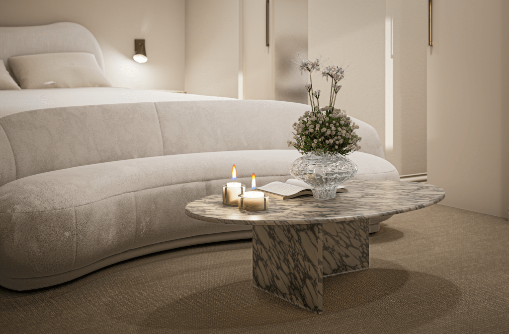 The living room centres around a sculptural marble fireplace — the home’s focal point and emblem of Galatea’s approach: balance, material integrity, and emotional resonance. A reinterpreted chequered floor links the cottage’s classical bones with its refined new palette, while layers of natural texture — boucle, oak, plaster — introduce depth and quiet warmth.